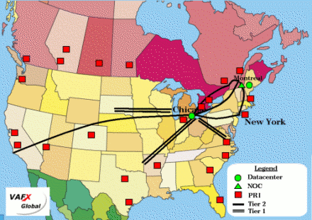 Notre centre de données principal est situé dans la région de Chicago. Cet emplacement stratégique permet de minimiser les délais et offre un haut débit de transmission à travers tout le continent nord-américain. Notre centre de donnée de secours ainsi que le centre d'opération du réseau est situé dans la région de Montréal.
